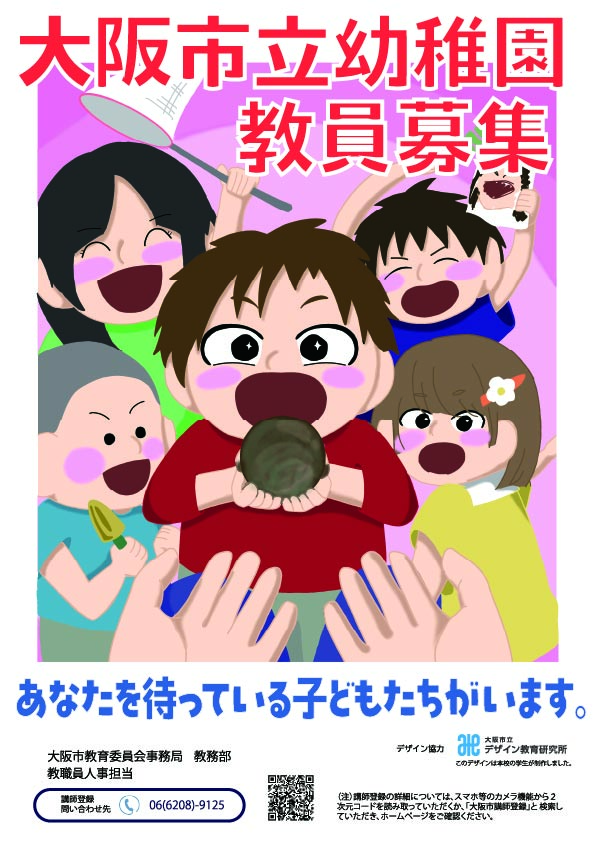【学生コメント】 「今回のポスターは、子どもたちに“遊ぼうよ!”と誘われている先生の視点で描きました。 このポスターを見た方に、『自分も先生として必要とされているんだ』と感じていただけるよう、温かさと親しみやすさを大切に表現しました。」 このポスターをご覧になった方がお一人でも多く応募してくだされば、うれしく思います。